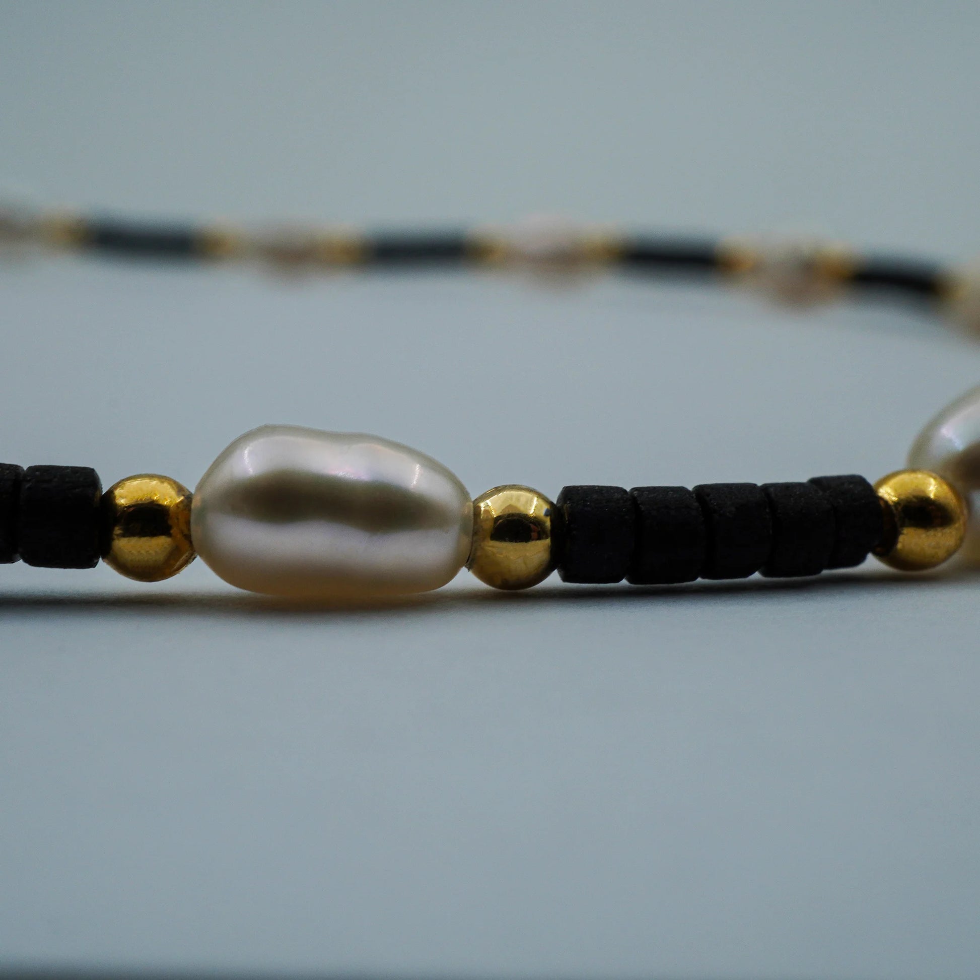 Artisanal Harmony Crafted in Bali with freshwater pearls, black onyx stones, and gold-plated beads.
